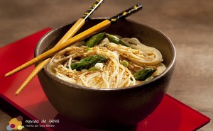 5- Coloque os aspargos picados, salpique as sementes de gergelim inteiras e regue óleo de gergelim e pimenta de sua preferência.